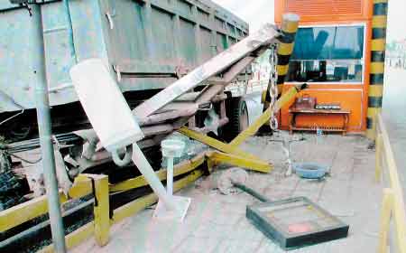 當(dāng)日上午11時(shí)05分,一輛車號為陜01-91339的運(yùn)沙石的大型拖拉機(jī),由西向東在進(jìn)入108國道黑河大橋收費(fèi)站時(shí),突然失控將右側(cè)防護(hù)欄和直徑約25厘米的鋼柱防護(hù)樁撞倒,直沖02道收費(fèi)亭,并將02道收費(fèi)亭撞變形,移位一米多遠(yuǎn),收費(fèi)亭內(nèi)設(shè)備灑落一地。隨后失控拖拉機(jī)又將01車道收費(fèi)亭撞傾斜、變形,車道上面費(fèi)額顯示器、攝像機(jī)、車輛識別器等設(shè)備均損壞,亭內(nèi)正在值班的工作人員李進(jìn)(男)、王麗(女)被撞傷。事故發(fā)生后,趕來的收費(fèi)站工作人員迅速將腿部受傷的李進(jìn)和王麗從變了形的收費(fèi)亭里抬了出來,肇事拖拉機(jī)車頭側(cè)翻,司機(jī)頭部、手部受傷。隨后,3名傷者被緊急送到周至縣醫(yī)院救治。