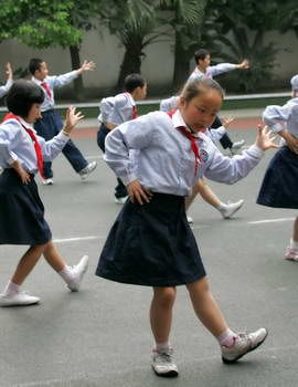 模仿古代“請”、“讓”、“孝”等系列動作,編制成一套極有古典韻味的體操!再配上《漁舟唱晚》的背景音樂,一邊“做操”一邊大聲朗誦國學(xué)名篇或者名句……昨日,記者獲悉,我市雙眼井小學(xué)耗時(shí)數(shù)月,創(chuàng)作出了一套“國學(xué)操”,將體操和國學(xué)的誦讀融二為一。據(jù)悉,這是目前全國第一套“國學(xué)操”。