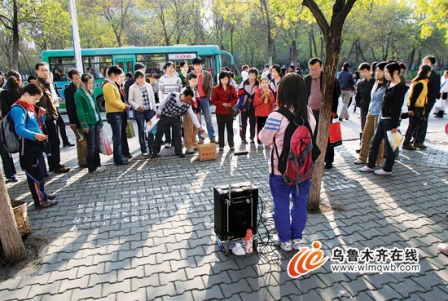 4月17日15時(shí)許,烏魯木齊市鐵路局十字路口的公交站牌旁,一個(gè)唱歌女子被圍得水泄不通。該女子身高1.5米左右,劉海,頭發(fā)散在肩上,身著粉色上衣、藍(lán)色長褲、白色運(yùn)動鞋,還背著書包。