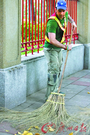 “五一”前夕,廣州市環(huán)衛(wèi)局組織起在穗外籍人士體驗環(huán)衛(wèi)工作,使更多的人理解和支持環(huán)衛(wèi)工作,同時也反映出普通環(huán)衛(wèi)工人對城市建設貢獻的點點滴滴。羅密歐自愿參加了這次活動,短短半日時間,他除了清掃馬路外,還嘗試了鏟“牛皮癬”、乘坐小黃車收運垃圾和到居民樓收垃圾袋等環(huán)衛(wèi)工作!俺隽艘簧砗,比去健身房效果好多了。我現(xiàn)在想去洗澡!”工作完畢后,羅密歐用流利的中文笑著告訴記者,還一邊擺出“鬼馬”的造型,讓人忍俊不禁。羅密歐今年30出頭,來廣州已兩年半,現(xiàn)在是一家意大利餐館的副董事長兼市場總監(jiān),偶爾也會在廣州的英語電視節(jié)目上客串主持。他說,其實環(huán)衛(wèi)工作對他來說不算十分新鮮,“我18歲中學畢業(yè)后第一份工就是室內(nèi)保潔,所以對環(huán)衛(wèi)工人的辛苦我有同感。”
