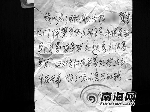 楊警官要求蔡某寫下一張收條,蔡某當場寫道:我以老鄉(xiāng)朋友身份為楊警官上門探望受傷女服務員,并找其領導上司商談妥協(xié)處理意外傷害事宜,由雙方協(xié)定妥善處理達到平安無事,收了一點小意思的錢。