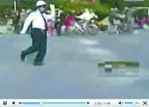 視頻于3天前出現(xiàn)在優(yōu)酷網(wǎng)上。打開(kāi)視頻,戴白頭盔、穿藍(lán)制服的男子在繁忙的路口指揮交通。