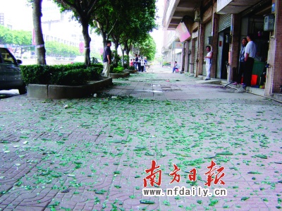 昨日,記者再次來(lái)到事發(fā)地看到,警方仍未解除警戒線,幾名民警在現(xiàn)場(chǎng)緊張勘察。事發(fā)街道兩旁的玻璃碎片仍是灑落一地,離爆炸核心位置20多米遠(yuǎn)的一家修理店老板介紹,很多玻璃碎片都是從對(duì)面街道飛過(guò)來(lái)的,他指著一塊插入卷閘門(mén)的石頭說(shuō):“這個(gè)也是從對(duì)面飛過(guò)來(lái)的,當(dāng)時(shí)爆炸的威力太可怕了。”