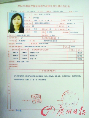 記者昨日查閱假羅彩霞當(dāng)年被錄取的紙質(zhì)檔案。這份編號為“520821102”的《湖南省2004年普通高等學(xué)校錄取新生名冊》上,“羅彩霞”的考生號為“04430521110708”,批次為“第二批”,錄取形式為:“計劃:國家任務(wù)定向”,上面還有羅彩霞的身份證號等考生基本信息。這份新生名冊的左下方加蓋了“湖南省普通高校招生委員會錄取專用章”的大紅印章。黃開烈說:“我們不能隨便懷疑這個考生是假的。我們每年招6000多名學(xué)生,每個都去懷疑是不可能的。造成假羅彩霞事件的本質(zhì)問題和根源問題不在貴州師大。他們造假能做到這一步,也是我們無法想象的!(文/圖 特派貴陽記者文遠竹)