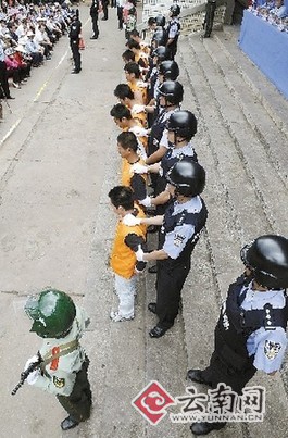 昨天下午1點30分,公判大會在富民縣鬧市區(qū)富民電影院門口準(zhǔn)時召開,露天會場戒備森嚴(yán),會場拉起警戒線,會場內(nèi)外、周圍街道上站滿執(zhí)勤民警,9名頭戴鋼盔荷槍實彈的民警、武警分別站在會場內(nèi)維持秩序。