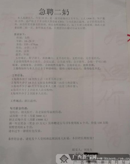 記者在網(wǎng)上找到了這張啟事的圖片,上面介紹說,招聘二奶的主角是浙江溫州一家服裝公司的CEO,姓劉,招聘的目的是為了滿足“工作出差、生活上的需要。”