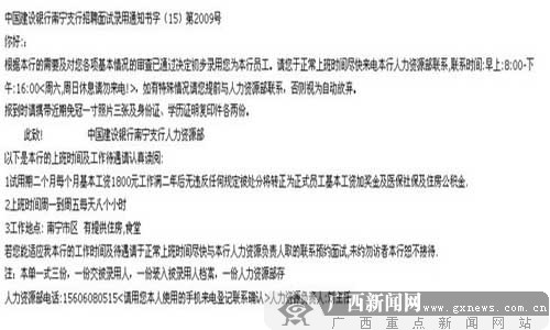 網(wǎng)友“l(fā)qqlauren”發(fā)帖稱,她即將畢業(yè)的妹妹最近收到一份“中國建設銀行南寧支行的面試錄用通知書”,錄用通知書上標注的工作待遇極具有誘惑力,試用期工資1800元/月,轉正后還有獎金、醫(yī)保、社保、住房公積金。通知書最后留有“人力資源部劉主任”的手機號碼和一個“95533nn@163.com”電子郵箱。