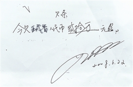 拿到錢后,雅暉寫了張欠條:“今欠老婆人民幣二十萬(wàn)!背_(kāi)始沒(méi)有細(xì)看,隔了兩天,又覺(jué)得不妥,找了個(gè)合適的機(jī)會(huì)提醒了雅暉一下,“他把老婆改成了我的名字,但是簽名是用的藝術(shù)簽名,一共有8條弧線,我實(shí)在沒(méi)認(rèn)出來(lái),不過(guò)我想以后都快是夫妻了,還計(jì)較這些干什么呢?”