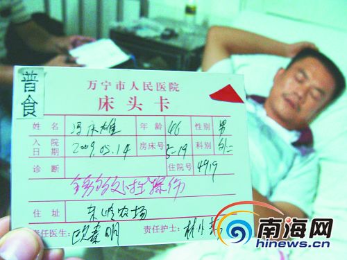 5月20日下午,記者在萬寧市人民醫(yī)院住院部見到了被打的收膠工馮慶雄,他正躺在病床上,表情看起來痛苦,不時用手撐在后腰撫摸腰間。據(jù)他的主治醫(yī)生介紹,經(jīng)診斷馮的傷情為:頭、胸、腰等身體多個部位軟組織挫傷,經(jīng)B超檢查發(fā)現(xiàn),其右腎下極挫傷。