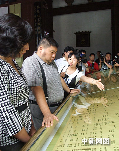今天,聽(tīng)說(shuō)毛澤東的孫子要回來(lái)尋根了,老老少少的清漾村村民早就等在了村口,村中的喇叭更是唱起了《北京有個(gè)金太陽(yáng)》等革命經(jīng)典老歌。在熱烈的氣氛中,毛新宇夫婦走下了車(chē)子,他們親切地向村民微笑示意,舉手投足間流露出了對(duì)這片土地特有的感情。在群眾的簇?fù)硐,毛新宇夫婦邁進(jìn)了清漾祖宅大門(mén)。在合敬堂里,他們饒有興趣地翻閱了《清漾毛氏族譜》,并且聆聽(tīng)了江南毛氏衍脈和族譜的介紹,當(dāng)?shù)弥约菏墙厦系?8代嫡孫時(shí),毛新宇不住微微頷首。