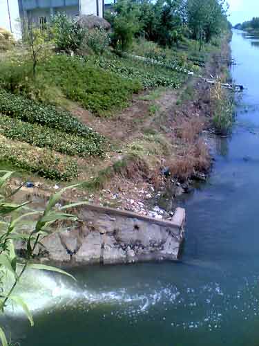 記者順著指引,沿這條戰(zhàn)備河而上,走不多遠(yuǎn),終于在盛家村發(fā)現(xiàn)了一片綠水與乳白色交融的水域。河?xùn)|岸橋頭一簇蘆葦?shù)暮竺,一股污流正?0度角泄入河中。通過觀察水面泡沫的走向,記者發(fā)現(xiàn)這股污水正潛向不遠(yuǎn)處的水廠取水口。