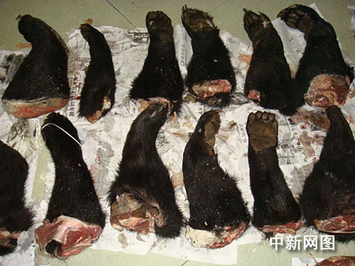 “這批被查獲的熊掌斷口血痕還隱約可見(jiàn),包熊掌的紙張上印有外文”防城港警方介紹說(shuō)。
