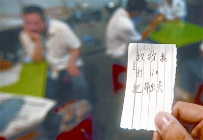 吃飯間,一名女子始終低著頭,機(jī)械地往嘴里扒飯。一旁的一男一女興致高漲,不停地說話,操著外地口音。幾分鐘后,這一男一女從餐桌起身,走到餐館門口打稀飯。這時,坐在桌旁的女子迅速塞來一張紙條。王師傅的妻子嚇了一跳,她走到廚房,展開蜷曲的紙條,上面赫然寫著“救救我,打110”(見圖)。王師傅趕緊報警,他擔(dān)心對方在民警來前就離開,還一再叮囑妻子,如果對方付錢結(jié)賬,就盡量拖延時間。