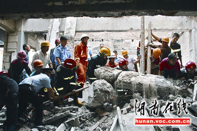 9時(shí)50分,湘潭市雨湖、特勤兩個(gè)消防中隊(duì)火速趕赴現(xiàn)場(chǎng),當(dāng)時(shí)已有一名被困者被成功救出,另有一名民工的下半身被死死壓住,動(dòng)彈不得;其上半身被砸得遍體鱗傷,胸口正好卡在斷裂的房梁下,血流不止。