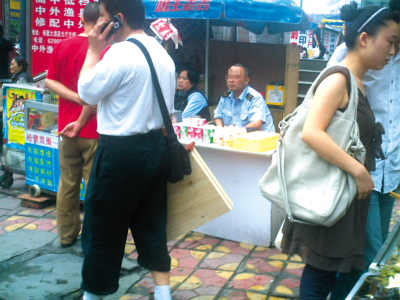 6月13日,網友“透明”在大渝網發(fā)帖稱,當日他前往楊家坪辦事,看到一個光頭城管正在幫一個小販看攤,詫異之余用手機拍下了這一幕。記者從照片中看到,在人行道上,一個由一把太陽傘和一個玻璃柜臺組成的雜貨攤后面,該城管正悠閑地坐著,似乎很享受守攤的感覺。