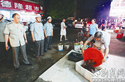 8時許,記者隨洪山區(qū)執(zhí)法隊來到圖書城路,遠遠便看到幾處燒烤攤上空煙霧繚繞、氣味嗆鼻,一家油燜大蝦店外,五六張餐桌橫亙在人行道上,桌上蝦殼堆成小山,桌下污水橫流!袄习澹氵@樣出店占道經(jīng)營違反了市容管理規(guī)定,請你配合一下,把桌子收到店里去吧!薄斑M去哪有生意做?”勸說、宣傳無效,50名執(zhí)法隊員圍站成一圈,雙手背在身后,沉默地注視著食客和坐在一旁的老板。如此“對峙”了27分鐘后,兩桌食客先“頂”不住了,草草結(jié)賬離去,老板與另兩桌食客又“堅持”了片刻,最終悻悻地收拾起桌椅搬進了店內(nèi)。