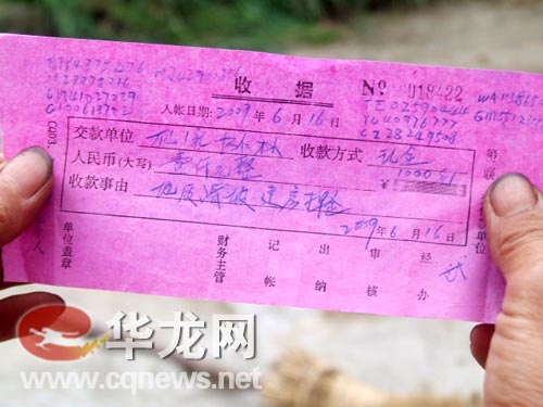 聞聽記者在當(dāng)?shù)夭稍L,村民楊仁林的妻子將隨身攜帶的押金收據(jù)拿出來展示,楊仁林家編號(hào)為0018422號(hào)的白條“收據(jù)”上顯示,其收款事由為“‘地質(zhì)滑坡建房押金’壹仟元整”,交款時(shí)間為2009年6月16日,經(jīng)辦人:“武”。收據(jù)左右角上注明了其交款面額的編號(hào)。