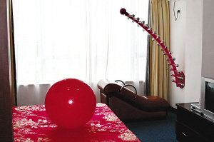 五十多平方米的房間內(nèi),燈光溫馨曖昧,一張大紅床格外引人注目,情趣用品一應(yīng)俱全。記者看到,跟一般的酒店里陳設(shè)不同的是,房間里有很多奇形怪狀的家具。據(jù)周某介紹,除了床是電動(dòng)床以外,還有歡樂(lè)椅、情趣球、S形沙發(fā)等!斑@些可不是體操運(yùn)動(dòng)器材,而是情趣酒店的特別設(shè)施,專門供夫妻情侶性生活用的!