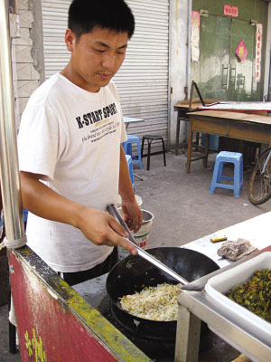 鮑斌是揚(yáng)大體育學(xué)院03級(jí)學(xué)生,因?yàn)榧彝ソ?jīng)濟(jì)困難,讀大三的時(shí)候,小鮑決定休學(xué)創(chuàng)業(yè),選擇的創(chuàng)業(yè)項(xiàng)目是再普通不過的蛋炒飯。他沒有向父母透露半點(diǎn)風(fēng)聲。在外面租了一間房子,開始了創(chuàng)業(yè)歷程。開始,小鮑的生意不是很景氣,后來,大伙對(duì)他的手藝認(rèn)可后,生意便開始紅火起來!拔颐刻鞙(zhǔn)備的炒飯都會(huì)比別人賣得快,所以經(jīng)常早收攤,算下來,平均一天能賣幾百盒!滨U斌一臉興奮地告訴記者,刨去成本、平常的開銷,每年掙10萬元非常輕松。因?yàn)樯庠絹碓交,他給淮安老家的父親打了個(gè)電話,請(qǐng)二老過來幫忙。從此兩個(gè)老人正式給兒子打起“下手”來。