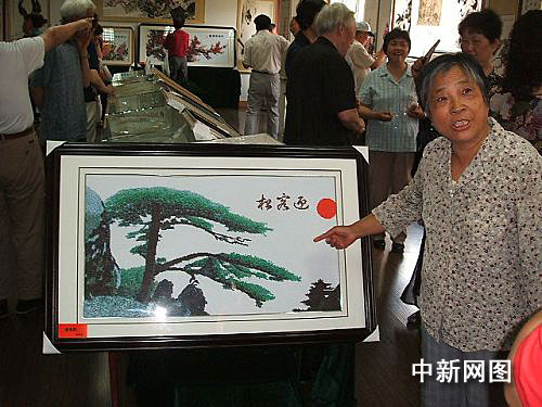 中新網(wǎng)鎮(zhèn)江七月一日電 (李君 王致同) 這是一幅長(zhǎng)一米、寬六十厘米的《迎客松》圖,遠(yuǎn)看似乎是照片或油畫(huà),近看確是十字繡品,圖上繡成的翠柏勁松,傲然挺立,引人入勝。令人們難以置信的是,繡品作者竟然是鎮(zhèn)江市八十高齡老翁徐菊生。昨天,作為老人獻(xiàn)給共和國(guó)六十華誕的這幅十字繡品《迎客松》,在鎮(zhèn)江市老年活動(dòng)室“露臉”,令人驚嘆不已。