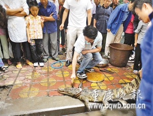 昨下午,綦江縣橋河社區(qū)陽(yáng)光幼兒園旁的人行道。一條一米六七的鱷魚(yú)被兩小伙合力抓尾巴拖出鐵籠,一把鐵鉗夾住鱷魚(yú)頸,鐵錘敲頭、尖刀割喉……就這樣,本性兇殘的鱷魚(yú)在五六十人圍觀下,被殺死肢解,嚇得不少小朋友蒙眼,膽小的成人失聲尖叫。