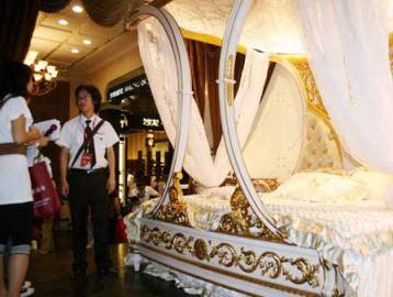 走進五號館展場,幾乎所有人的目光都會立即被成都本土企業(yè)制造的一張價值五十萬元人民幣的豪華大床所吸引。據制造商介紹,這張價值五十萬元人民幣的豪華大床是用橄欖木材耗時六個月純手工雕刻而成,“這張床的設計理念取意于西班牙古代皇室風格。除做工精美外,整張床還鑲嵌了純金箔和二十六顆施華洛世奇水晶,目前單張床的市場售價在五十萬元人民幣以上!