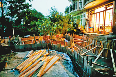 同樣,相隔幾米的一幢排屋北面的綠地上也堆著一捆捆的木料和一包包沙袋。許先生說(shuō)他們材料準(zhǔn)備好了,將擇日動(dòng)工。