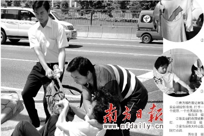 隨后,南方都市報(bào)攝影記者陳奕啟與管理員吵起來,推搡中管理員撕裂記者的衣服,并再出招“鎖喉功”。一名市場管理員一拳打中陳奕啟頭部,推搡中陳奕啟被推下人行道,然后又被按倒輪番連踢帶踹,其中一人雙手鎖住記者喉嚨,一人強(qiáng)行搶走攝影包。
