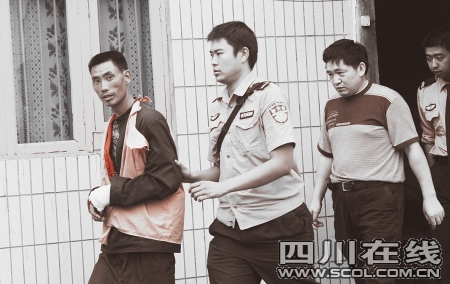 昨日中午12時,劉啟寬穿著彭州市看守所的衣服,戴著手銬,左手包扎著紗布,被警方帶回事發(fā)現場。他個子高高的,又瘦又黑,沒有穿鞋,始終低頭不語。就在劉啟寬指認現場的時候,其哥哥劉啟保也回來了。兩兄弟對望一眼后,都匆匆把視線移向別處。