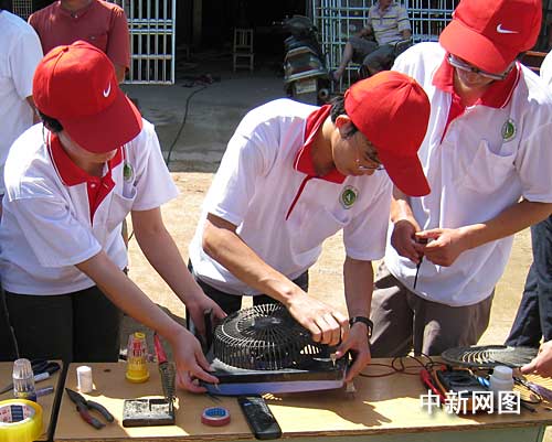 7月9日,我們無(wú)線電協(xié)會(huì)的成員又在這里當(dāng)起了義務(wù)維修工。起初,只是有不少群眾圍觀,并沒(méi)有人拿來(lái)舊電器要修理。他們有些遲疑:這群孩子,能修好嗎?過(guò)了好大一會(huì)兒,一位大嬸拿來(lái)了一個(gè)電飯鍋,我們趕緊接了過(guò)來(lái)。由于沒(méi)有專業(yè)人員修理,電飯鍋已經(jīng)好久不能用了。最終,我們憑借過(guò)硬的技術(shù)贏得了大嬸的贊揚(yáng),同時(shí)也讓圍觀的人少了份猶豫,多了份信任。大家開(kāi)始爭(zhēng)先恐后地拿來(lái)自己家里有問(wèn)題的電視機(jī)、電風(fēng)扇要我們幫忙修理!雖然烈日當(dāng)空,我們卻忙得不亦樂(lè)乎,連汗都顧不上擦!“看到鄉(xiāng)親們拿著修好的電器喜笑顏開(kāi)的樣子,我打心眼里高興!希望以后能為更多的鄉(xiāng)親服務(wù)!”一位隊(duì)員高興地表示。在一天的義務(wù)維修中,隊(duì)員們充分調(diào)動(dòng)了自己的專業(yè)知識(shí),積極聯(lián)系實(shí)際,提高自己動(dòng)手能力的同時(shí)又服務(wù)了鄉(xiāng)親。