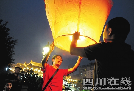 晚8點,合江亭邊天色還未全暗,“范跑跑”身著紅色T恤、休閑短褲和一群藝術(shù)家安靜地坐在竹椅上等候。8點30分左右,德籍華人藝術(shù)家蔡青招呼眾人,《祈愿》正式開始,范跑跑徑直走向安放孔明燈的紙箱旁!拔覀兊目酌鳠羰菑呐_北郵購過來的。除了要用孔明燈為地震逝者祈愿,還寓意海峽兩岸人對生命的尊敬。下面我和范老師將共同放飛孔明燈,愿意參與的市民都可以加入。”蔡青是此次活動的主要發(fā)起人,作為常年旅居國外的德籍華人藝術(shù)家,蔡青說多次前往映秀、北川等災(zāi)區(qū),大片廢墟令他很震驚。蔡青點燃孔明燈后,邀請“范跑跑”和他共同扶住燈的底框,將高達(dá)1米左右的孔明燈逐個放飛。
