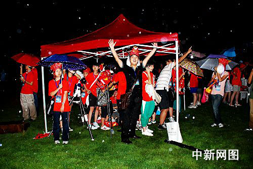 烏克蘭日全食觀測隊(duì)、俄羅斯觀測隊(duì)、北京日全食觀測隊(duì)……各個(gè)隊(duì)伍在雨中緊張地等待著,現(xiàn)場的喇叭里不斷傳來其他觀測點(diǎn)的最新消息,然而8:22分初虧的時(shí)刻到來時(shí),雨未停。終于9:35,日全食的一刻天全部黑了下來,雖然看不到,但現(xiàn)場還是響起了持續(xù)不斷的歡呼和尖叫聲,五分鐘的時(shí)間里,黑暗的山坡上閃關(guān)燈不斷,儼然一個(gè)“巨星演唱會(huì)”的陣勢。