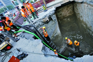 塌陷下方是一處污水井,修污水井須排空污水,F(xiàn)場搶修人員稱,從前晚就開始向外排水,排水集團昨日啟動數(shù)臺水泵抽升塌陷現(xiàn)場上游污水,并將污水抽到雨水井。