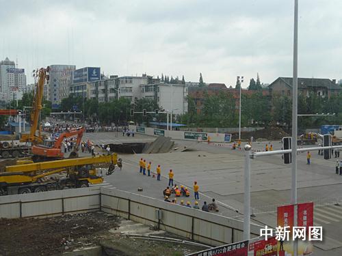 記者在現(xiàn)場看到,此路段實行交通管制,救援人員正在現(xiàn)場緊張施救。一輛藍色出租車還在塌陷坑中沒有被拖出,傾斜在塌陷洞旁的汽車已被拖走。