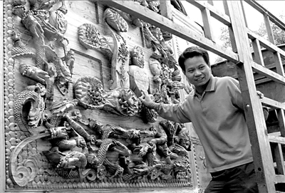 昨天上午,在豐臺區(qū)京石高速公路西道口附近,來自湖南婁底市新化縣的曹永文和他的大型木雕作品“中國興”,吸引了不少過往行人。一個多星期前,曹永文帶著他的這件木雕作品,從湖南老家出發(fā),欲進京將此作品獻給人民大會堂或國賓館,以慶祝建國60周年。