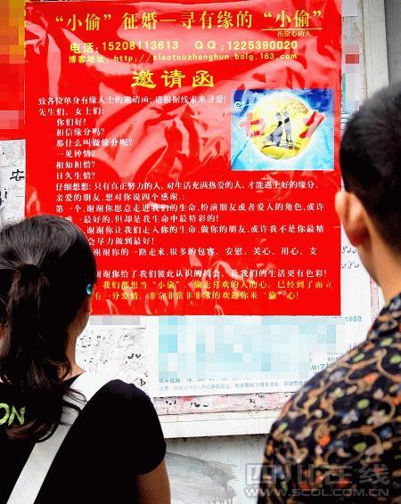 昨日上午11時(shí),記者在沙灣路128號(hào)小區(qū)門口的告示欄看見了“小偷征婚”的邀請(qǐng)函。大紅的邀請(qǐng)函十分顯眼,上面用黃、白兩色書寫著另類的征婚廣告詞,以及邀請(qǐng)者的聯(lián)系方式和博客地址!安粍(wù)正業(yè)還跑出來(lái)征婚!”圍觀者對(duì)此表示不屑。