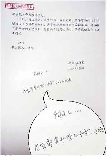 去年12月8日,李先生到法院查閱案件材料時,在一份起訴狀的末頁,看到有人在空白處寫下了兩行文字。上一行寫著“狗日的”字樣,下一行則寫著“沒有需要補償?shù)牧x務、事項和理由”字樣(見左圖)。夫妻倆認為,有人誤導和左右了此次判案。