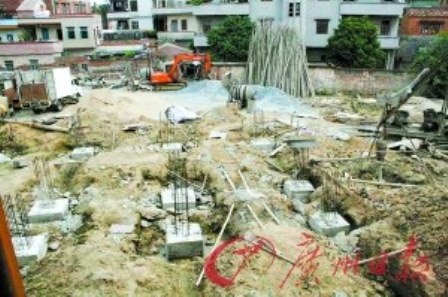 在村民的指引下,記者來到這片工地。該工地占地面積大約200平方米,一臺10來米高的打樁機(jī)豎立在工地中央,10來個(gè)水泥樁基已經(jīng)澆筑完畢。工地四周全是普通民居,工地離部分民居非常近,一些施工范圍甚至已到民居的屋檐下、窗臺下,而最近的水泥樁基離民居不超過3米。
