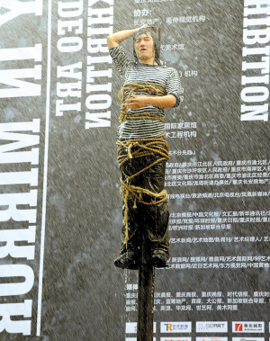 37攝氏度的高溫下,26歲的王軍被綁在近10米高的柱子上,先是被酷熱“折磨”了半小時(shí),后又被環(huán)衛(wèi)車的水龍頭沖淋了半小時(shí),耗費(fèi)了8噸自來水,總共耗時(shí)兩小時(shí)。這個(gè)名為《守望》的行為藝術(shù)作品昨天下午在黃桷坪102藝術(shù)區(qū)雷倒了不少人。