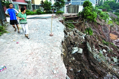 9月11日晚9:30,石小路64號(hào)附1號(hào)樓住戶邱國(guó)華聽(tīng)到一聲巨響,抬眼一看,小區(qū)后方的邊坡及圍墻瞬間化為烏有,所幸沒(méi)有人員傷亡。昨日6時(shí),記者到達(dá)事發(fā)現(xiàn)場(chǎng),民警已將現(xiàn)場(chǎng)封鎖,記者看見(jiàn)38米長(zhǎng)的邊坡已經(jīng)殘破不堪,邊坡的水泥地面已生出裂痕,坍塌面上也有幾道細(xì)長(zhǎng)的裂縫蔓延在10米多高的殘面上,坍塌的泥土磚石小山般堆積在小區(qū)邊的施工工地,半扇小區(qū)鐵門(mén)倒在地面,一根黑色管道裸露著,居民告訴記者,這根管道是天然氣管。