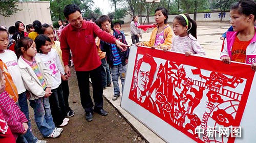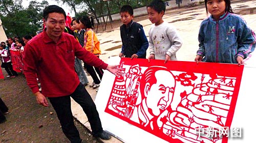 據(jù)了解,該校老師王贊強(qiáng)用一個(gè)月時(shí)間把《東方紅》、《江山多嬌》、《春天的故事》、《走進(jìn)新時(shí)代》等十首紅歌,剪出紅歌剪紙作品,來(lái)祝福新中國(guó)60華涎。每張紅歌剪紙用朱紙做原料,長(zhǎng)1.5米,寬0.8米!稏|方紅》剪紙內(nèi)容除毛澤東主席頭像外,還有學(xué)大寨、第一顆衛(wèi)星上天及原子彈爆炸等內(nèi)容!督蕉鄫伞酚泻\濤總書(shū)記頭像、奧運(yùn)會(huì)、神六上天等內(nèi)容,每張紅歌剪紙都包含著濃烈的時(shí)代氣息。
