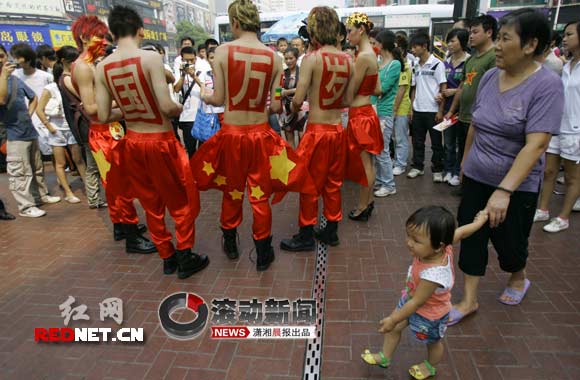原來,5名自稱90后的男女,身上被涂彩繪,發(fā)型怪異,穿著國旗短褲,背上分別寫著“祖國萬歲”四個字,在這里搞行為藝術。另外一名妖艷女子,則在給路人發(fā)放紅色傳單。
