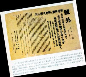 “這本書里我精選了其中的312張?zhí)柾,其中有解放?zhàn)爭(zhēng)時(shí)期人民解放軍解放30個(gè)省會(huì)城市和許多大、中城市時(shí)發(fā)行的報(bào)紙?zhí)柾,以及‘三大?zhàn)役’、渡江戰(zhàn)役等號(hào)外。特別是10多張開(kāi)國(guó)大典號(hào)外,見(jiàn)證了毛主席在天安門城樓上宣告‘中華人民共和國(guó)中央人民政府已于今日成立了’的偉大歷史性時(shí)刻!睆埻ψ院赖卣f(shuō),書中收藏的大部分號(hào)外是首次面世,其中最珍貴的有兩張:一張是1949年4月21日《人民日?qǐng)?bào)》出版的號(hào)外“南京國(guó)民黨政府拒絕國(guó)內(nèi)和平協(xié)定毛主席朱總司令命令全軍堅(jiān)決徹底干凈全部殲滅敵人”;另一張是1949年4月24日,解放軍攻入太原,當(dāng)日《人民日?qǐng)?bào)》出版“南京反動(dòng)政府宣告滅亡狼狽奔逃我正向南京急進(jìn)各界已成立治安維持委員會(huì)致電毛主席歡迎解放軍入城”的號(hào)外。