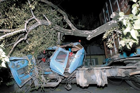 一旁,一個(gè)樹(shù)杈壓在貨車駕駛室上,使其嚴(yán)重變形,風(fēng)擋玻璃全部破碎。一棵直徑約0.8米的大樹(shù)倒在人行道上,樹(shù)根部已經(jīng)腐爛,樹(shù)冠將馬路占去了四分之三。