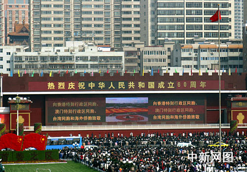 記者上午9時許來到蘭州東方紅廣場看到,這里早已是人山人海,川流不息。10時,當黨和國家領(lǐng)導人在首都天安門城樓上的畫面出現(xiàn),此間民眾不約而同的鼓掌歡迎。