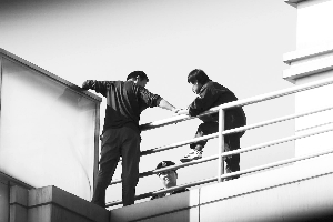 在該大廈樓頂?shù)奈髂辖,一男子站在樓頂護(hù)欄外,雙手握著欄桿,并不時扭動著身體。為避免該男子情緒波動,警方一邊勸說該男子,一邊疏散圍觀群眾。