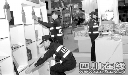 昨晚10點,新會展中心各展館里一片忙碌。在一群正在安檢的帥氣黑衣特警中間,3個扎著發(fā)髻的女特警格外引人注目。除負責現(xiàn)場指揮的教導員吳虹外,28歲的羅蕾正用伸縮臂鏡檢測著一食品展臺頭頂?shù)闹,而今年剛入警的周蓉,則彎腰在一排展柜前仔細檢查著。和男特警一樣,她們都穿著帥氣的黑色警服,戴著警帽,不施粉黛,右胸前印有“成都特警”4個大字的閃光背心,將她們襯得格外颯爽。