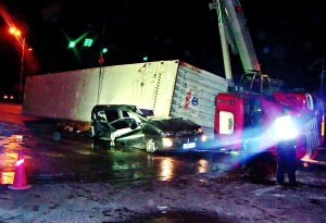 據(jù)有關(guān)部門介紹,昨日凌晨2時(shí)15分許,司機(jī)袁龍駕駛一輛內(nèi)蒙古牌照的集裝箱式大貨車,由密云縣前往遼寧省沈陽(yáng)市運(yùn)送貨物。途中,該車經(jīng)通順路,由北向南行駛至順義區(qū)通順路米各莊路口時(shí),與一輛西向東駛來(lái)的現(xiàn)代商務(wù)轎車相撞。其間,貨車司機(jī)袁龍向左打輪躲閃過(guò)程中向右發(fā)生側(cè)翻,將商務(wù)轎車壓在右側(cè)貨箱之下,造成轎車內(nèi)人員全部被困。