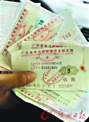 另外一名“干了十幾年”的老頭則直接告訴記者,他的票都是假的,都是“克隆票”,記者在他提供的發(fā)票上看到,他的發(fā)票跟一般販子賣的不同,多了存根聯(lián),但是比真票要短和窄,全部蓋了“廣州市越秀區(qū)新**海鮮酒家”的發(fā)票專用章。記者用手摸溫變油墨標(biāo)志,標(biāo)志也能變色,不過(guò)與真發(fā)票對(duì)比起來(lái),標(biāo)志顏色要淺一些,變色效果也不明顯。