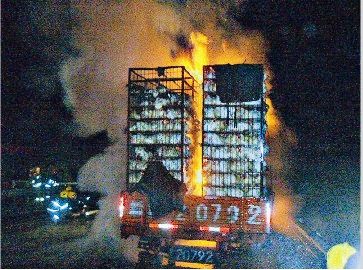 昨晚7時(shí)許,太舊高速公路去往太原方向435公里處,一輛運(yùn)送烏雞的貨車在行駛中輪胎突然起火。經(jīng)過(guò)陽(yáng)泉消防人員40分鐘的緊急撲救,終于撲滅了大火,解救了差點(diǎn)變成“燒雞”的3000只烏雞。